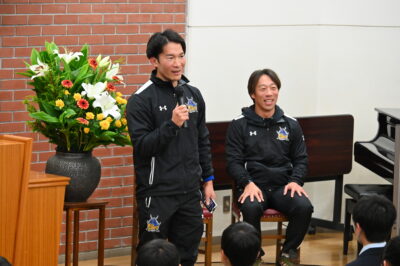 ラグビー ワイルドナイツスポーツプロモーション理事長 三宅 敬さんと、理事の大塚 貴之さんが、チームプレーや、聴覚障がいのある選手から、思いやりの大切さや、障害スポーツの理解、人権の大切さなどのお話をしてくださいました。