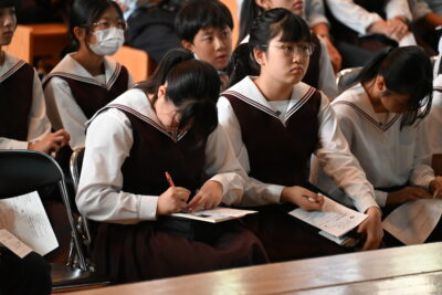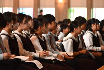 中学生はメモを取りながら、熱心に2人の発表を聞いていました。
