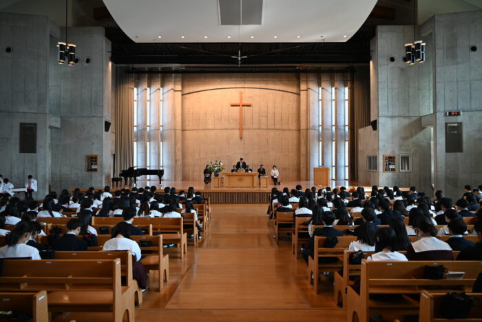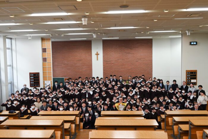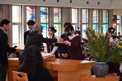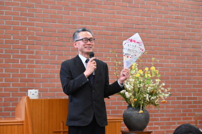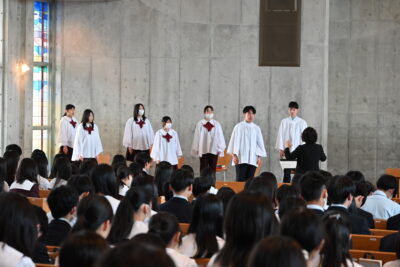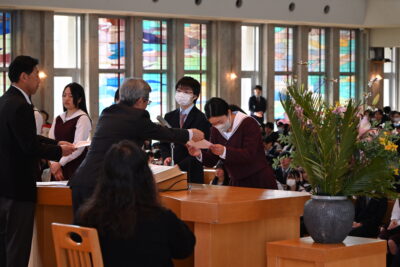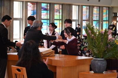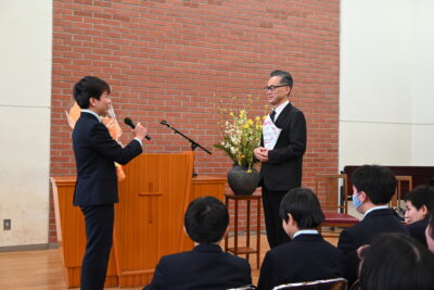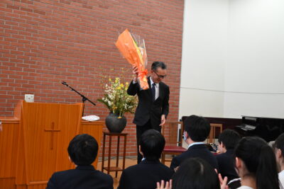 終業式が終わった後、中学生は小礼拝堂に移動して阿部先生にサプライズで花束を渡しました。